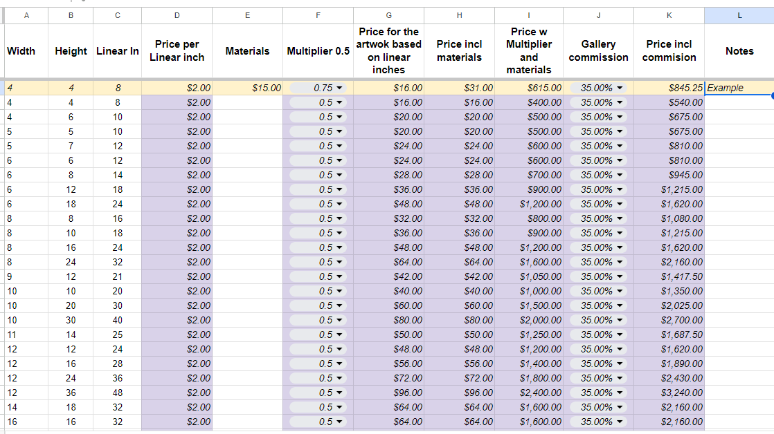 It is a very simple formula but often the suggested prices ends up being way too low for original art.